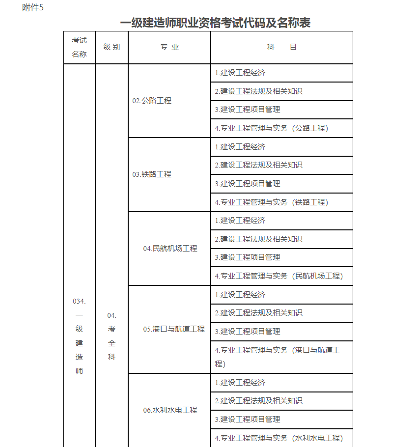 5.一級(jí)建造師職業(yè)資格考試代碼及名稱(chēng)表